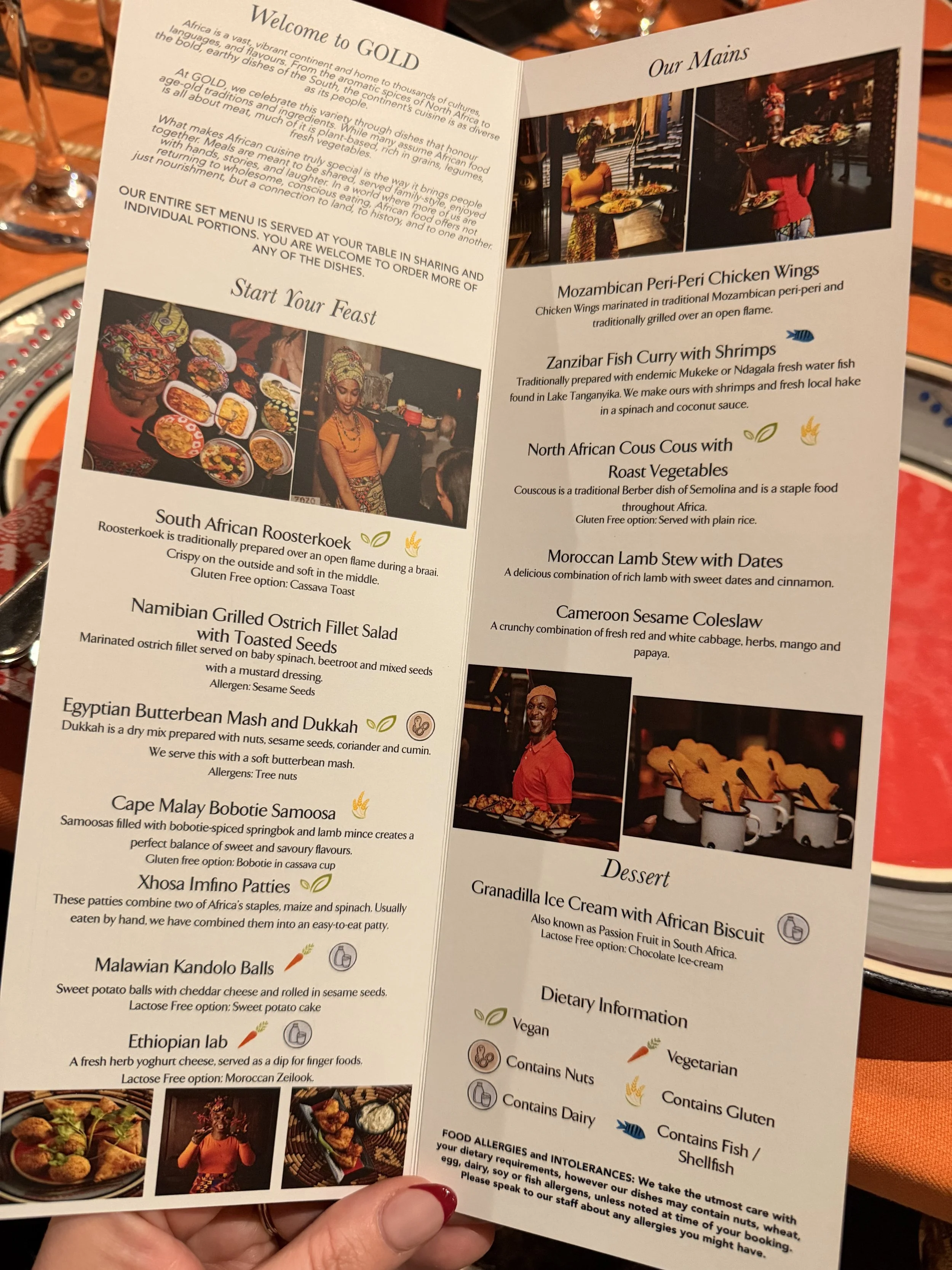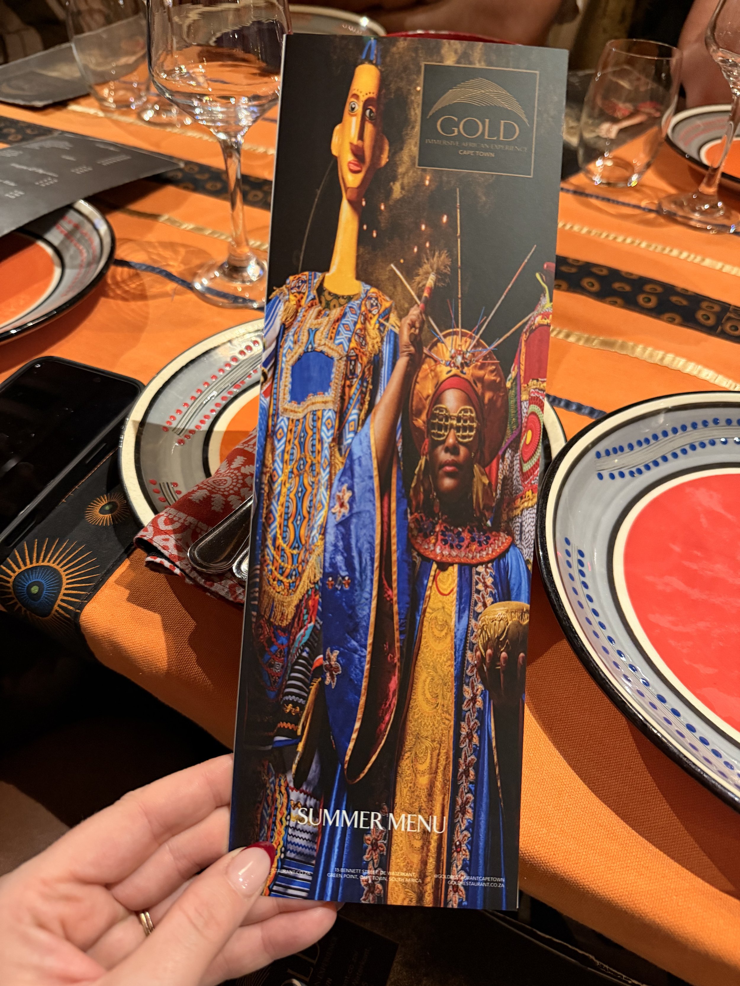 Our final dinner was at the famous GOLD restaurant. It is a truly immersive dining experience like no other in Cape Town. They serve a 13-course menu served family style, which highlights different dishes from all over Africa. From Namibia to Egypt and of course a few Cape Malay dishes as well, you truly get to enjoy a full culinary experience. They also have a few different shows throughout dinner and even had a woman that offers face painting, which of course Sadie and I participated in.